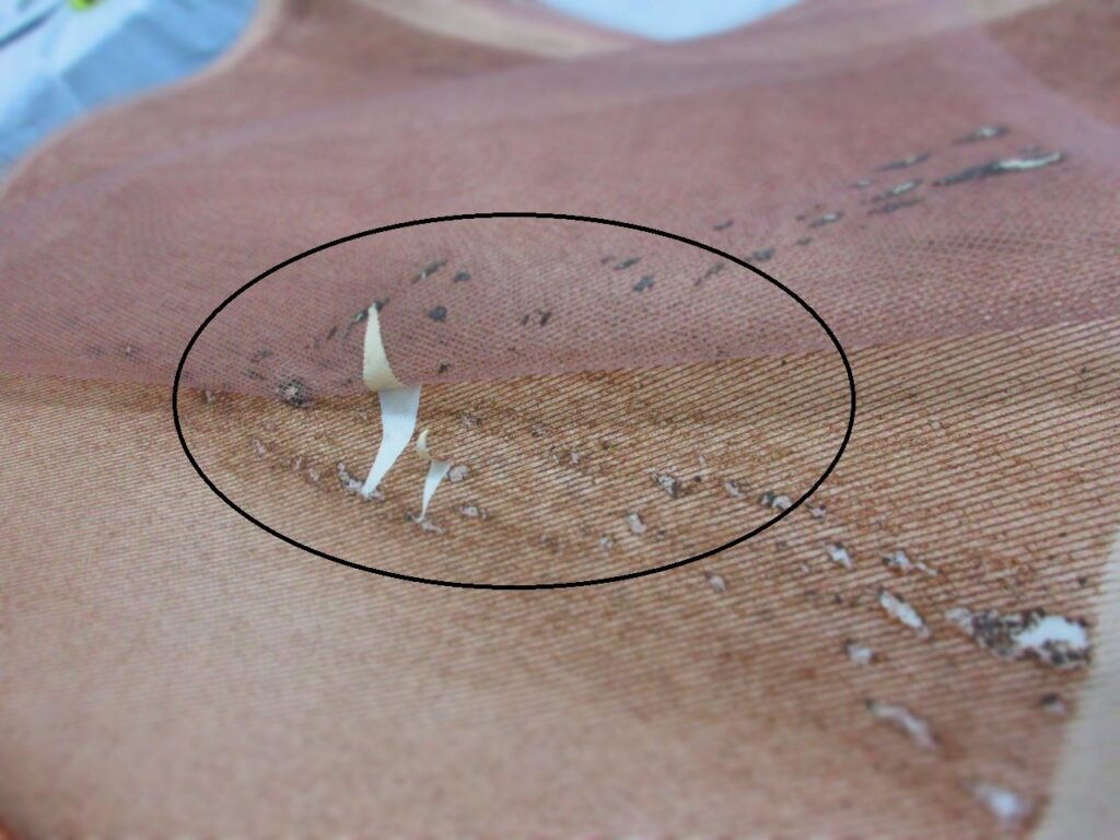 We were surprised to observe a sticky or oily, or glue-like substance on the membrane sheet, which