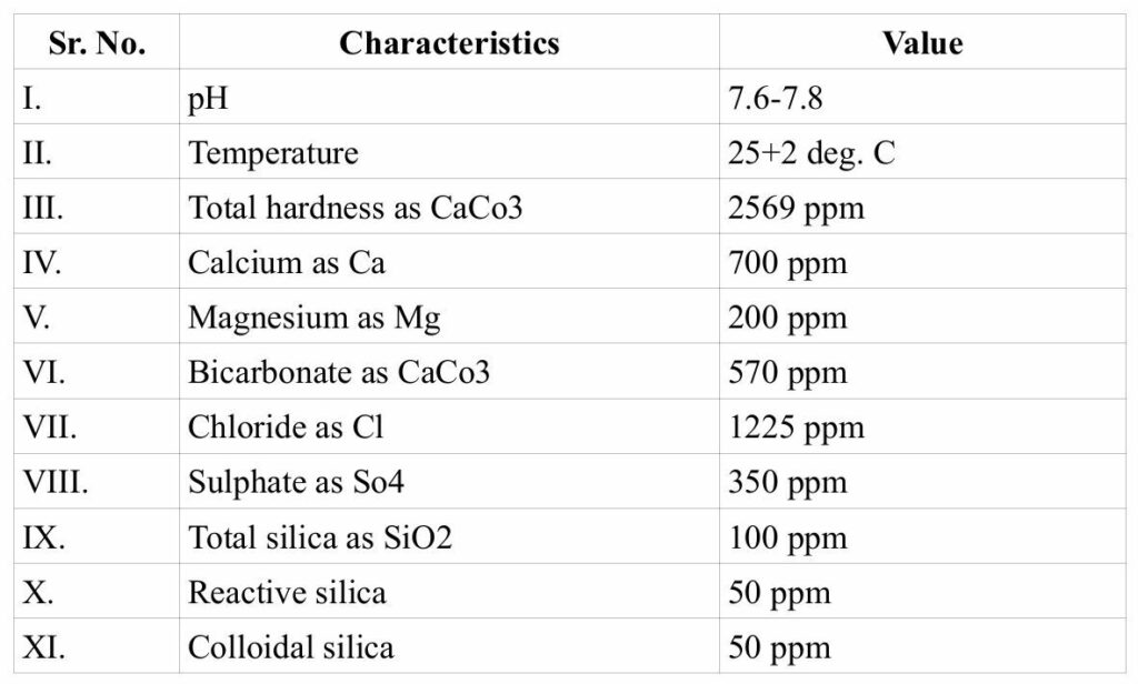 - The synthetic water is prepared in DI water. The tentative characteristics of the synthetic water used are as follows (it may vary + 5 %) (indicative characteristics, these may vary from customer to customer)