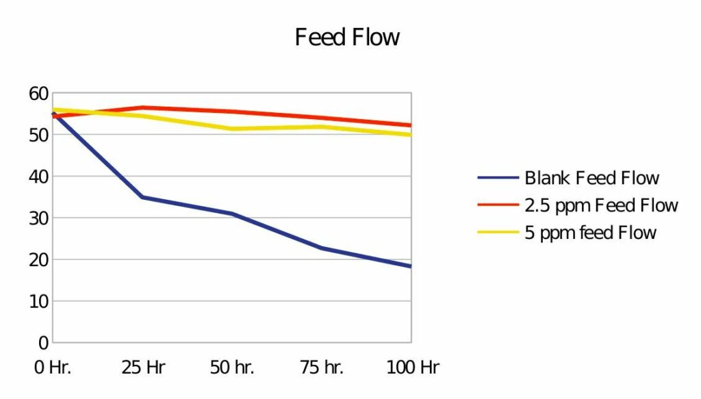 - 06. The reduction in feed flow with 2.5 ppm of dosages was observed approximately 3.82 % while the reduction in feed flow with 5 ppm dosages was approximately 10.88 %.