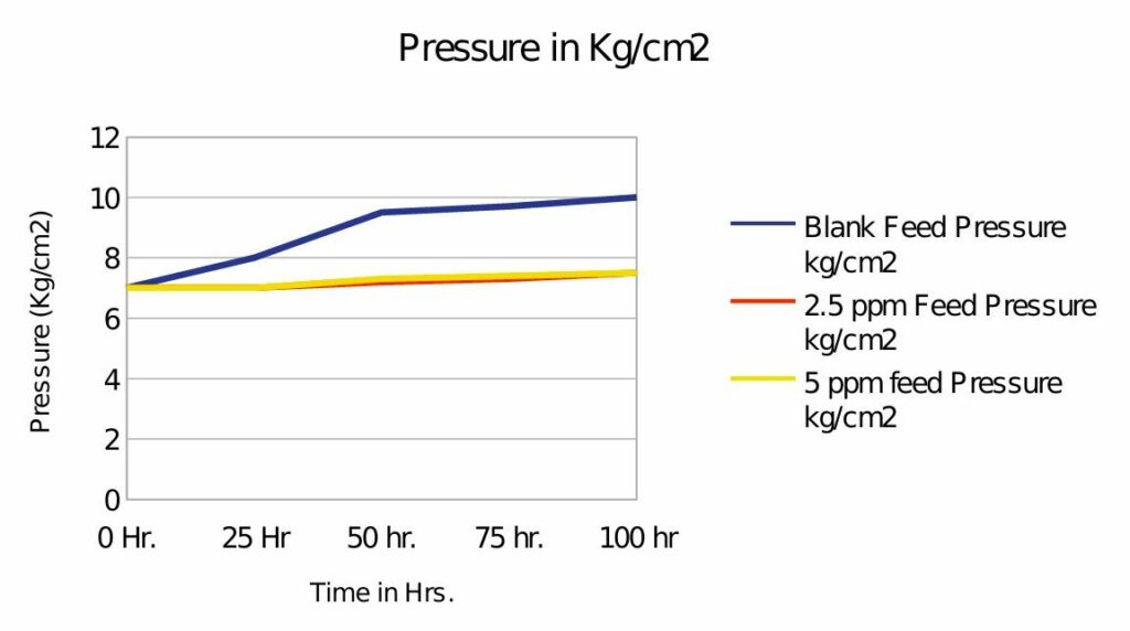 - 07. The feed pressure of the blank system has been increased by 42.86 % while in the case of 2.5 ppm dose and 5 ppm dose, feed pressure increased only up 7 %.