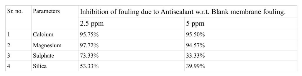 After the completion of the 100-hour run, the membranes of all the systems are deshelled and their fouling is analysed for the parameters such as Calcium, Magnesium, Sulphate, and Silica. The percentage inhibition of the Calcium, Magnesium, Sulfate, and Silica on the membrane processed with a 2.5 ppm dose and with 5 ppm dose of “ABC ” antiscalant is calculated with respect to blank membrane fouling, and the results are tabulated as follows.
